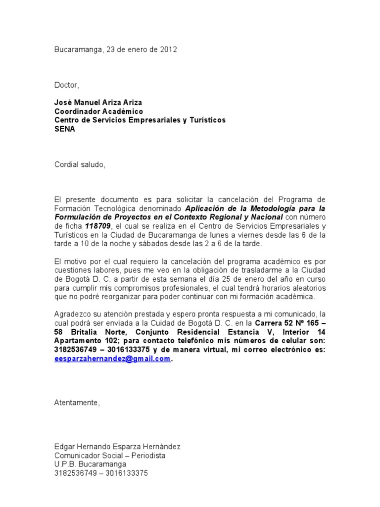 Corrección de Matrícula (La solicitud debe contener código y grupo de la asignatura a cancelar ). En este vinculo podrá descargar formatos de cartas para realizar trámites frente al comité, solicitud de permisos, reglamentación y presentación de trabajos de. Se puede utilizar para cancelar de servicios telefónicos, bancarios, contratos o pedidos. Cancelación extemporánea de semestre.